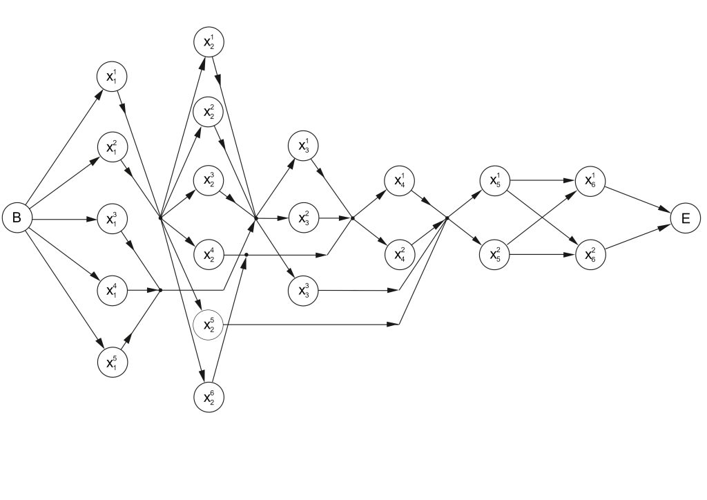 The set of possible structural variants that perform the general function of the assembly system is presented in Fig. 2 in the form of a network model. The elementary devices are arranged in 6 columns in accordance with the partial functions they perform. The possibilities for combining the elementary devices into structures that perform the general function of the assembly system are shown by arrows. Each path connecting the beginning (B) and the end (E) of the network model represents a possible structural variant.