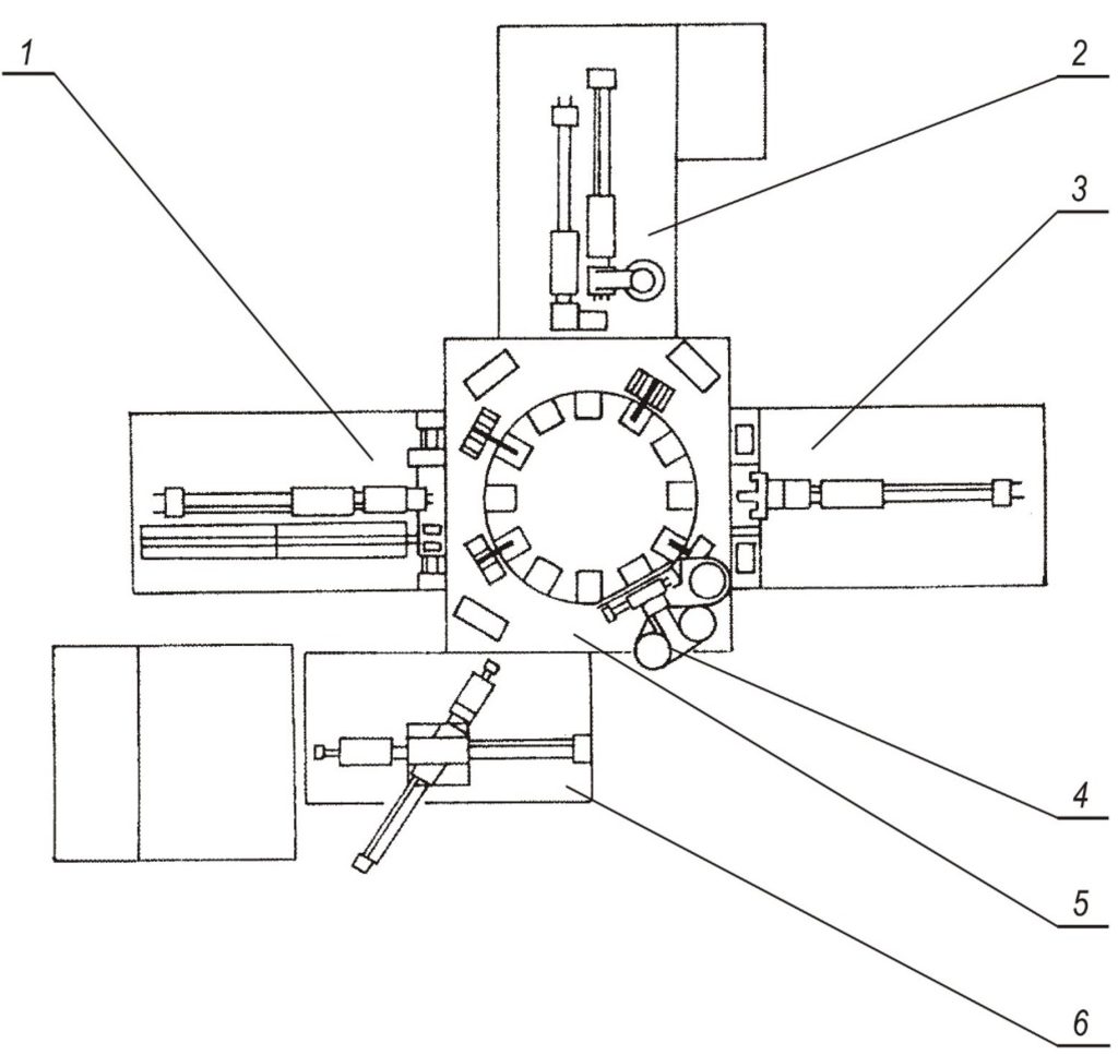 This device is implemented on the basis of a linear synchronous transport system, 4 control positions, 36 assembly devices and a device for pushing the catchers of the assembly devices.