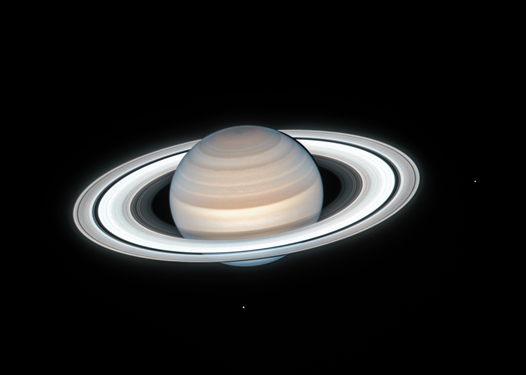 На снимката се виждат и две от многобройните луни на Сатурн. Мимас е мъничката точка вдясно на изображението, а Енцелад – малко по-голямата точка в долната част на изображението.