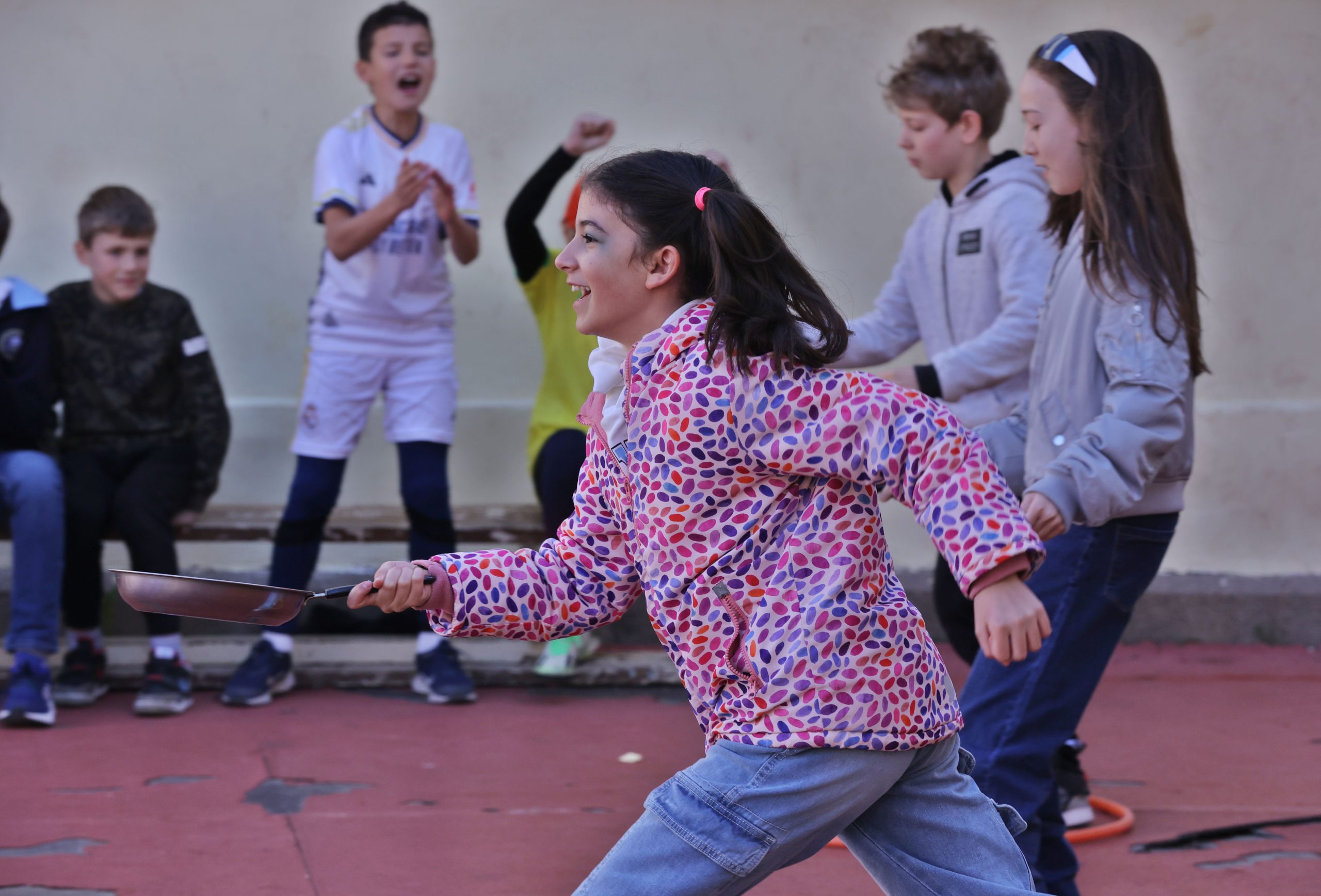 Идеята е да се сплотят децата от всички възрасти и да се намали агресията в училището. Именно така се стига и до състезанието с палачинки, в което децата трябва на щафетен принцип да преминават през препятствия, държейки тиган с палачинки. Освен палачинките в игрите се включва и киселото мляко – малчуганите играят по двойки със завързани очи, като единият храни другия с млякото. Играта е за време – най-бързата двойка печели.