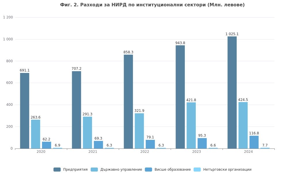 Сектор „Предприятия“ отново е най-големият от четирите институционални сектора, в които се осъществява НИРД, като неговият дял е 65,1% (1,025 млрд.лв.) от общите разходи през 2024 г. Година по-рано в него бяха съсредоточени 64,3% (943,8 млн.лв.) от общите разходи.