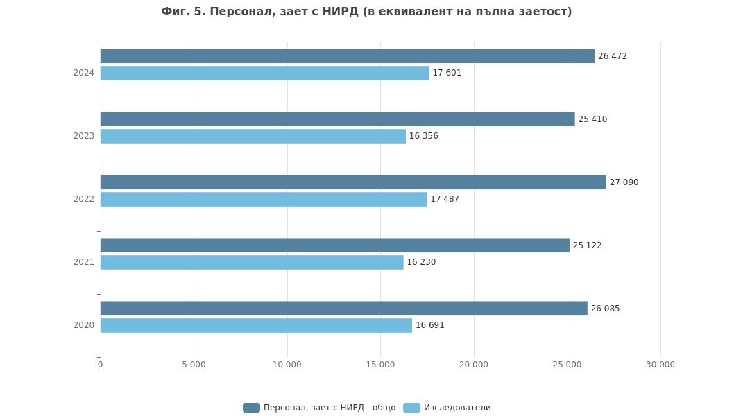 като той достига 26 472 души (в еквивалент на пълна заетост). От тях броят на изследователите е 17 601 при 16 356 година по-рано, или ръст от 7,6%. Делът на жените от общия персонал, зает с НИРД, е 48,2%.