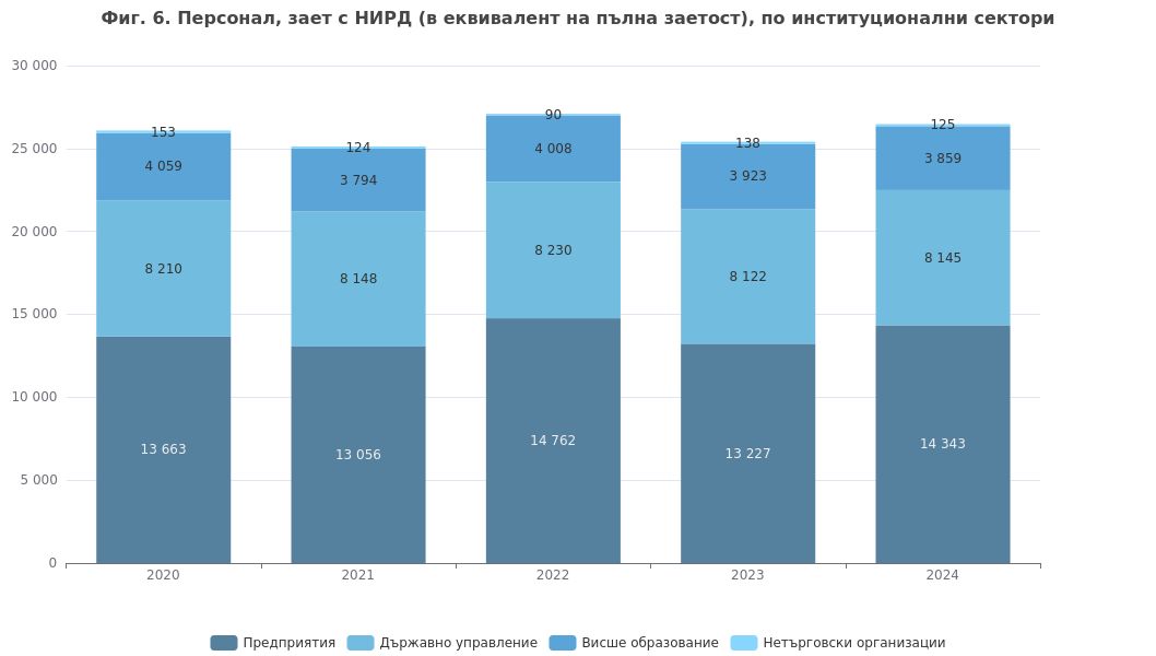 Основната част от заетите с НИРД през 2024 г. е съсредоточена във фирмите и научните институти от сектор „Предприятия“ – 54,2% от общия персонал, или 14 343 души. За сравнение през 2023 г. неговият дял е 52,1%, или 13 228 души. В организациите и институциите от сектор „Държавно управление“ научна дейност осъществяват 8145 души, или 30,8%. С научни изследвания и разработки в сектор „Висше образование“ са ангажирани 3859 души, като относителният им дял е 14,6% от всички заети с НИРД. Година по-рано в сектора са заети 3923 души или 15,4% от свързаните с НИРД изследователи. В нетърговски организации с НИРД са заети 125 души.