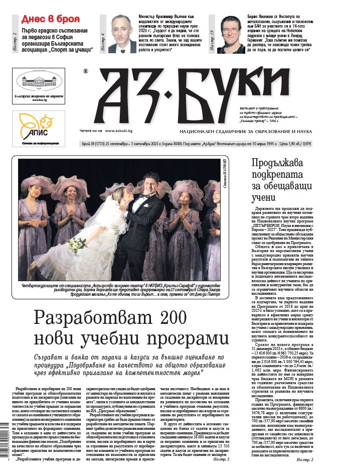 <h4><img class="size-medium wp-image-165892 alignleft" src="https://azbuki.bg/wp-content/uploads/2025/09/azbuki-2025-38-213x300.jpg" alt="" width="213" height="300" />В новия брой четете:</h4> - Разработват 200 нови учебни програми - Българската асоциация „Спорт за учащи“ организира първо градско състезание за столични педагози - Отличия за медалистите по природни науки: Националните олимпийски отбори се завърнаха с 39 медала от най-престижните състезания в света - От дигиталната математика до себепознанието: В СУ „Св. св. Кирил и Методий“ в Рудозем въвеждат иновация след иновация в учебния процес - Всичко може да се постигне с добри дела - Морската градина във Варна става учебна стая на открито - В Университета на Илинойс започва Програма по българистика - Наш изследовател проучва устойчивостта на газопроводите за пренос на водород [flipbook pdf="https://azbuki.bg/wp-content/uploads/2025/09/v.-az-buki-br.-38-2025-g.pdf"] <a href="https://azbuki.bg/wp-content/uploads/2025/09/v.-az-buki-br.-38-2025-g.pdf">Изтеглете</a> броя на вашeто устройство.
