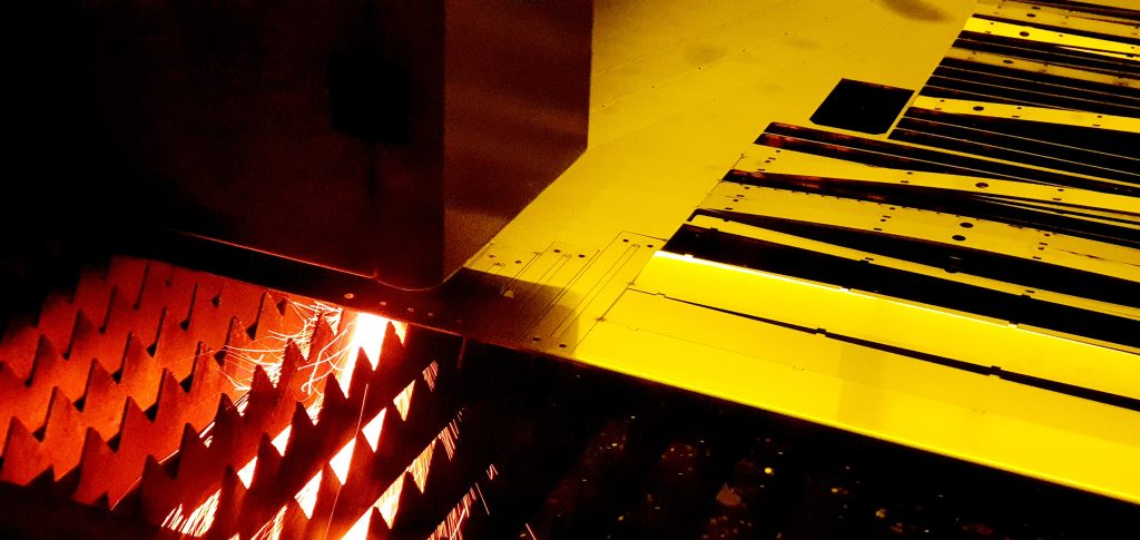 Figure 4 shows the actual process of fiber cutting. In this specific experiment, the cutting is conducted with stainless steel AISI 304 (1.4301). Practically, each material requires certain cutting parameters to be selected/optimized for sufficient results. Depending on the thickness of the sheet-metal parts, the cutting nozzle is replaced by the operator.