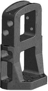 There is no need to simplify the fixture model geometry, as it is not overly complex and the 3D model is used as is for the analysis. Bolted connections to the armature are presented by imprints of bolts to the fixture and thus are not included in the model. Used for simulations geometry model is shown in Figure 3 b).