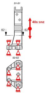The model is constrained as it is shown on Figure 4 b). Vertical direction is constrained on the both top down and top contact surfaces as to represent mounting to the armature. Sine profile from 100Hz to 5000Hz at 40g was used for validation of the fixture – as it is used for experimental tests.