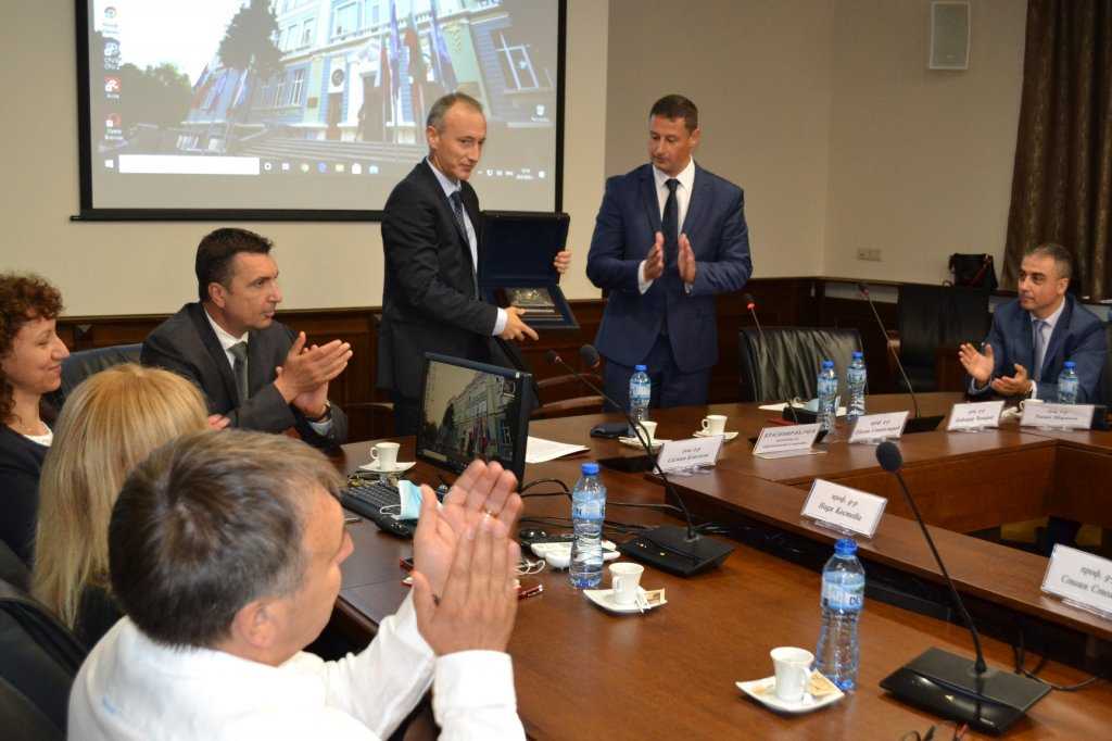 Ректорът проф. д-р Евгени Станимиров връчи на министъра на образованието почетния плакет на ИУ – Варна. Той разказа за постиженията, свързани с дигитализацията и пред-