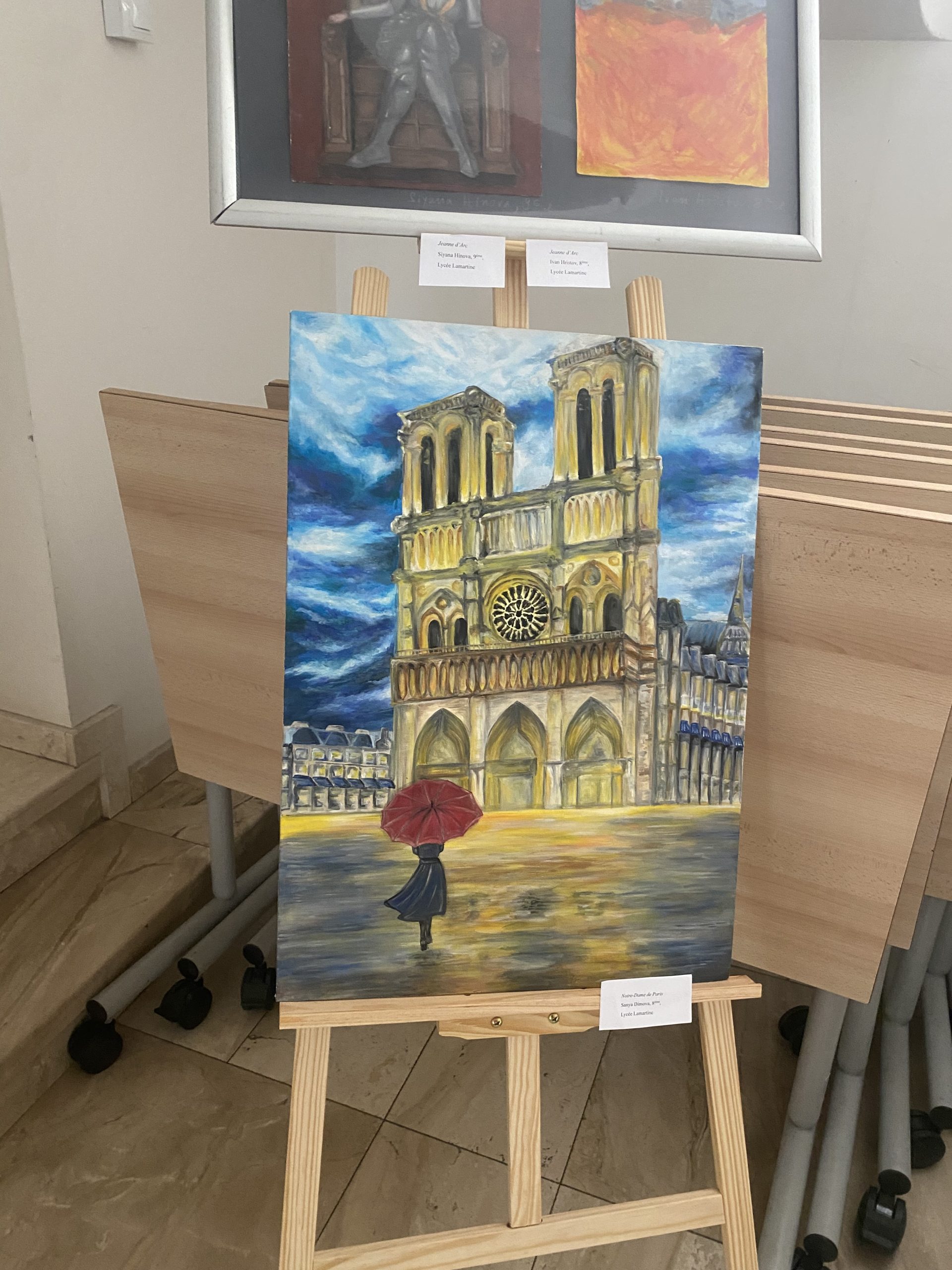 Учениците от VIII до XII клас под ръководството на своя неуморим преподавател по изобразително изкуство Светлана Тодорова са се вдъхновили от историята и културата на Франция и са пресъздали в рисунките си емблематични за страната хора, места и сгради. Осмокласничките Ема Колева и Виктория-Рая Берова са нарисували Наполеон Бонапарт. Антон Черкезов от XII клас е направил невероятен портрет на Едит Пиаф.