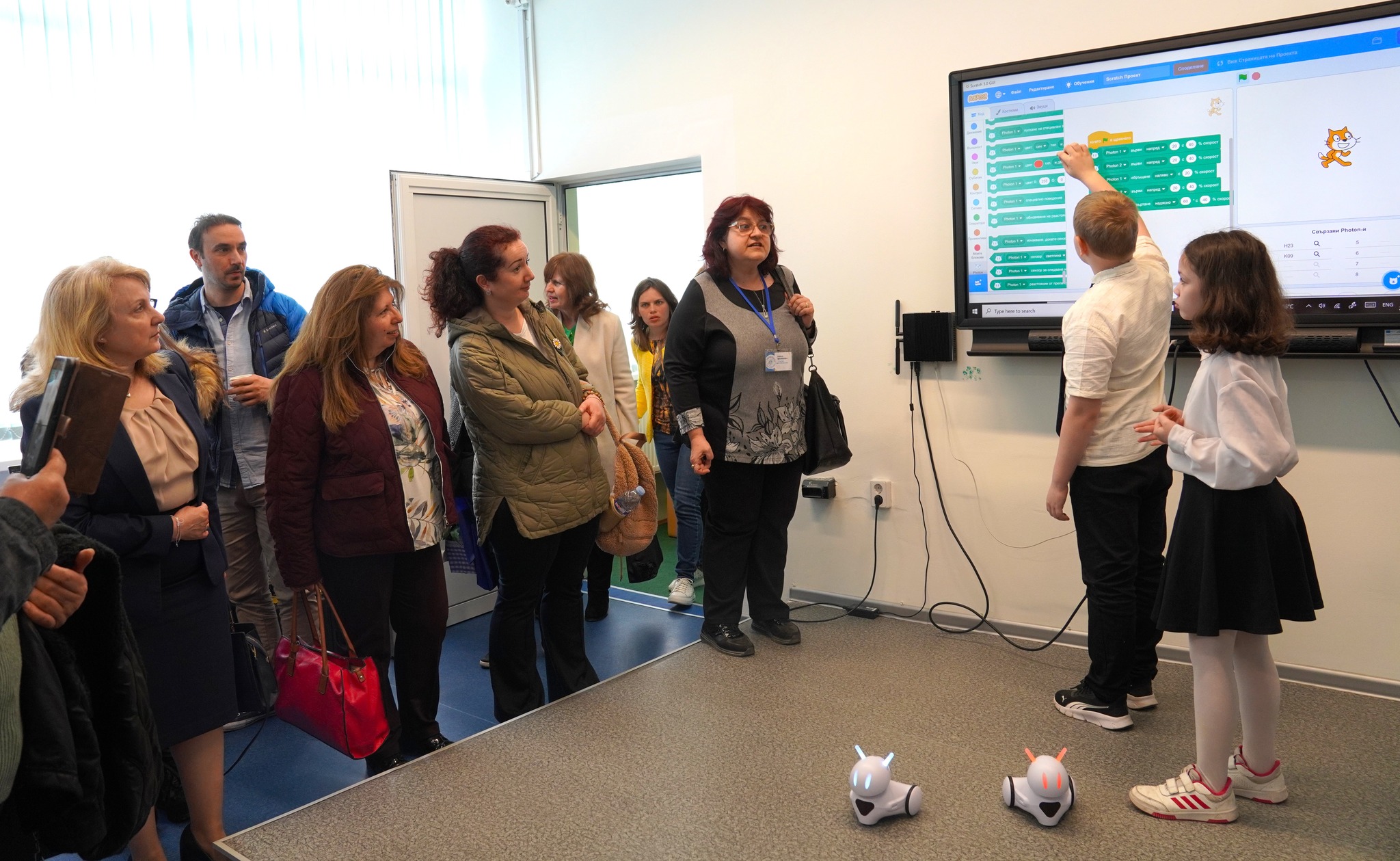 При откриването учениците впечатляват гостите с демонстрации на програмиране и управление на образователни роботи (mBot2, LEGO® Education SPIKE™ Prime, Photon),