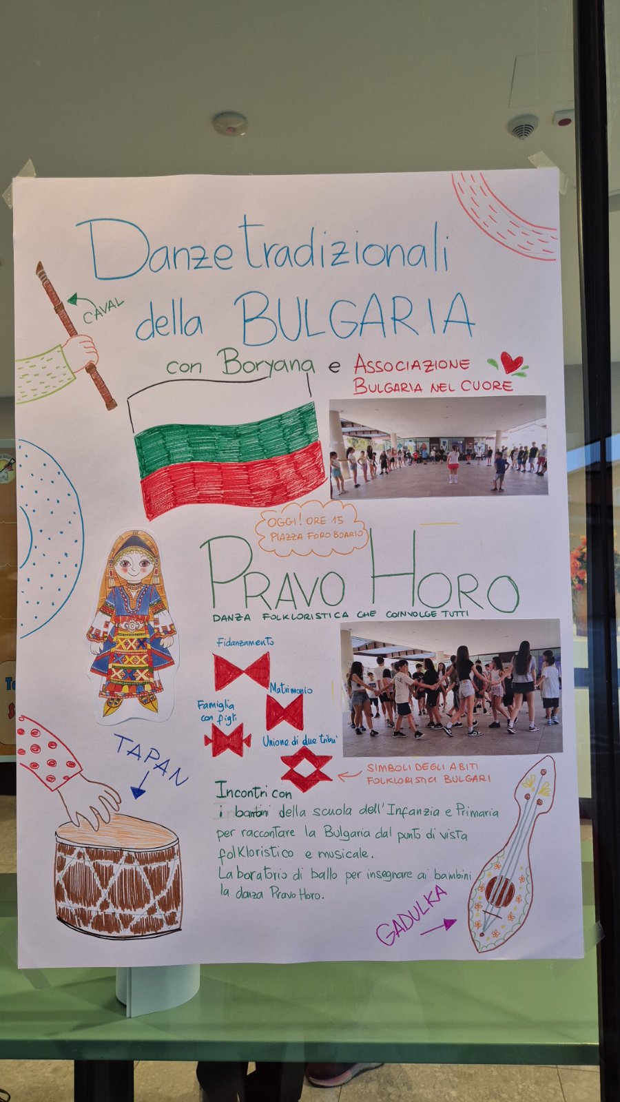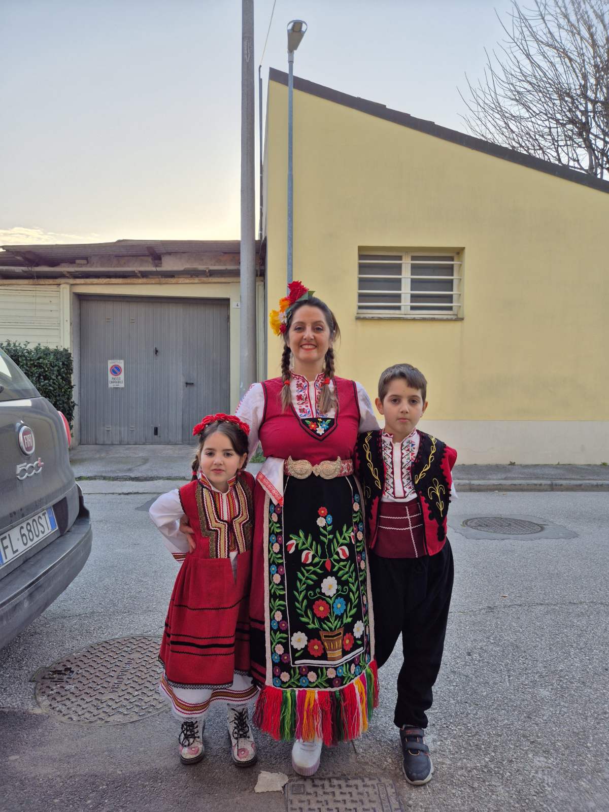 Заедно с гостите правят асоциации между знамената на България и Италия. Боряна разказва за фолклорните зони в България, показва различни носии и споделя за символиката на елементите по тях. Накрая децата се обличат с носиите и започват да разграничават какво е саяк, риза и престилка. А на мегдана, облечени в носии, изиграват право хоро и така местните хора имат възможност да се запознаят с българската фолклорна музика.