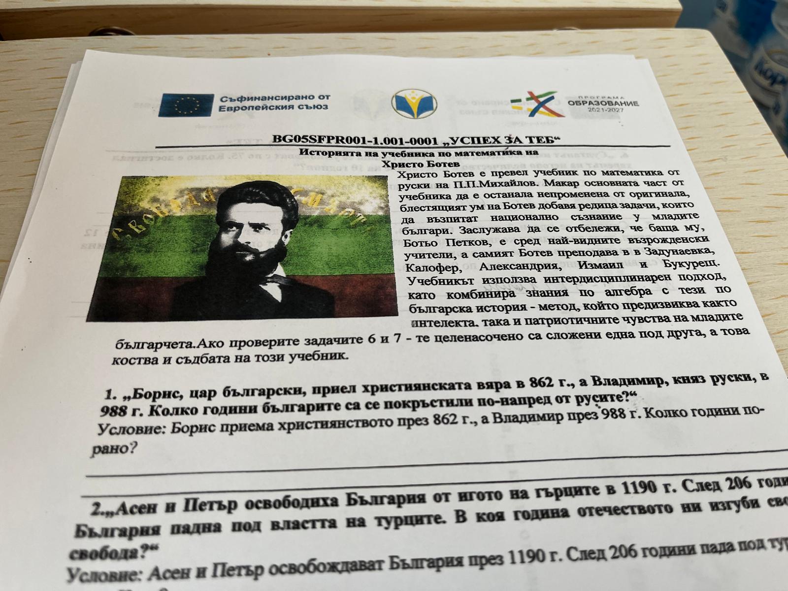 За най-големите имаше интересни задачи от учебника по математика, преведен от руски от Христо Ботев – трябваше да правят изчисления по зададени дати на исторически събития, като приемането на християнството от цар Борис и последвалото покръстване, въстанието на Асен и Петър и др. Имаше и STEM задачи, свързани с Априлското въстание.