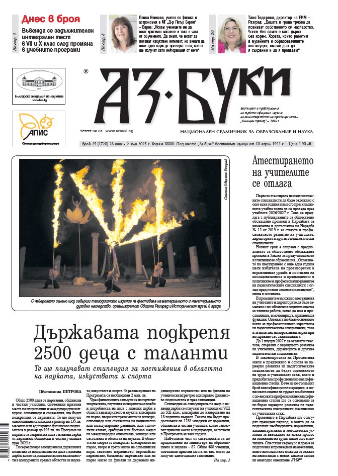 <h4><img class="size-medium wp-image-156716 alignleft" src="https://azbuki.bg/wp-content/uploads/2025/06/azbuki-2025-25-213x300.jpg" alt="" width="213" height="300" />В новия брой четете:</h4> - Държавата подкрепя 2500 деца с таланти - Издателство „Аз-буки“ търси студенти за практика - Интегрален тест в VII и X клас след промяна в учебните програми - Открий своята професия: С демонстрации и разговори с кандидат-гимназисти 40 столични училища представят специалностите, които предлагат за прием след VII клас - Прием в „Медицинска техника“ в Русе наесен: Професионалната гимназия по електротехника и електроника „Апостол Арнаудов“ разширява дуалното обучение - Дървото носи топлина: Лесовъди, модни дизайнери и кулинари създава Професионалната гимназия в Долна баня в продължение на 100 години -Литературата в последните български банкноти: Изображенията върху парите като кратък исторически разказ, посредник, но и носител на послания* - В лятната програма на Историческия музей в Разград децата участват в спортни игри и се обличат в римски дрехи [flipbook pdf="https://azbuki.bg/wp-content/uploads/2025/06/v.-az-buki-br.-25-2025-g.pdf"] <a href="https://azbuki.bg/wp-content/uploads/2025/06/v.-az-buki-br.-25-2025-g.pdf">Изтеглете</a> броя на вашeто устройство.