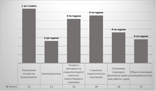 В изследването взимат участие общо 131 студенти от специалност „Социална педагогика“, редовна форма на обучение (фиг. 1). Общо 32 студенти от първа академична година са обхванати в компетентното ориентираното обучение по дисциплината „Теоретични основи на възпитанието“. Студентите от втората година на обучение, взели участие в компетентностно ориентираното обучение, са 13 по дисциплината „Етнопедагогика“. Общо 26 студенти в третата година на своето академично обучение участват по дисциплината „Теория и методика на социалнопедагогическото консултиране и съветване“ и 28 – по дисциплината „Социалнопедагогически практикум“. Общо 18 по „Позитивни подходи и физическа намеса при работа с деца“ и 14 по дисциплината „Обща и училищна психодиагностика“ участват от четвърта академична година. Участниците са на възраст между 20 и 27 години, като средната възраст е 22 г. Изследваните лица са основно жени.