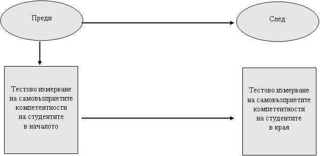 За да бъде установена ефективността на компетентностно ориентирания подход във връзка с обучението, студентите се тестват с изготвения инструмент непосредствено след началото на зимния семестър и веднага след приключването му. С други думи, взелите участие в проучването студенти са направили първоначална самооценка на текущото си ниво на компетентности в началото на зимния семестър (2023/2024). След това е въведен новият компетентностно ориентиран подход за период от 10 седмици. В края на зимния семестър (2023/2024) студентите отново правят самооценка на настоящото ниво на компетентности. В допълнение, същата процедура е приложена в периода март – юни 2024 г. по една от дисциплините, предлагани в летния семестър, а именно социалнопедагогически практикум. Въпреки че не е оптимален метод за тестване на ефективността, такива оценки „преди – след“ не са рядкост в изследователските проучвания, като разликата между оценката преди и след сесията е важна, тъй като влияе върху интерпретацията на данните и решението за преминаване към следващата фаза на интервенцията или надграждане в компетентностно ориентиран подход (Moore et al. 2018).
