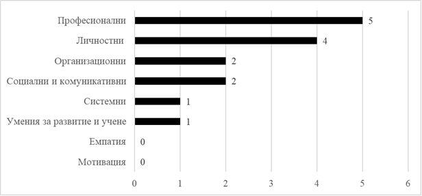 - личностни компетентности (мотивация, отговорност, наблюдателност, оперативна готовност, аналитично и критично мислене);